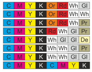 8 colores (cian, magenta, amarillo, negro, naranja, rojo, blanco, barniz) e imprimación, imprimación para calcas.